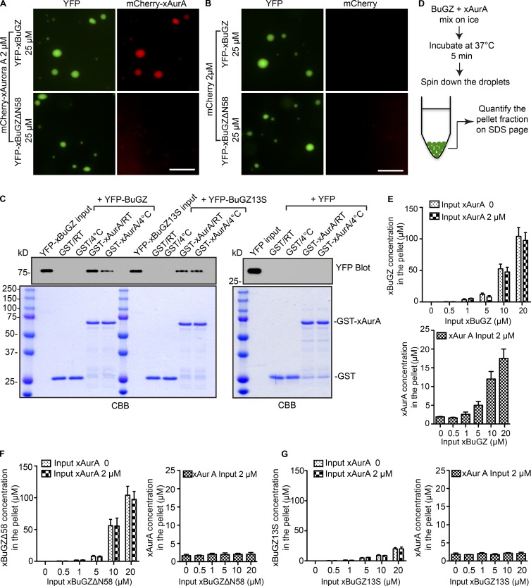 Figure 4. Effects of BuGZ phase separation on AurA binding. (A and B) Purified YFP-xBuGZ or YFP-xBuGZΔN58 was incubated to allow coacervation in the presence of purified mCherry-xAurA (A) or mCherry (B). Bars, 10 µm. (C) Purified YFP, YFP-xBuGZ, or YFP-xBuGZ13S were incubated with purified GST or GST-xAurA at RT or 4°C followed by GST pulldown, Western blotting (0.1% of total reaction and 10% of total YFP-xBuGZ and YFP-xBuGZ13S pulldowns were analyzed), and Coomassie Brilliant blue (CBB) staining (1% of the total reaction and 10% of total pulldowns were analyzed). (D) Schematic of droplet spindown assay. (E–G) Quantification of YFP-xBuGZ and xAurA (E), YFP-xBuGZΔN58 and xAurA (F), and YFP-xBuGZ13S and xAurA (G) in the pellets (X axis) against the initial input xBuGZ proteins (Y axis). Error bars indicate SEM.