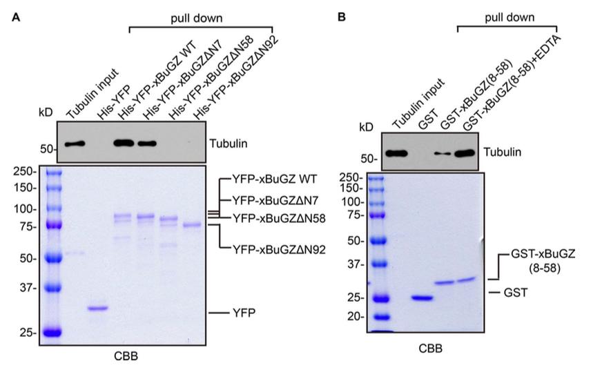 Figure S3. Tubulin binding to BuGZ involves the rst 58 amino acids, including the zinc nger sequence, and is reduced in the presence of EDTA. (A) Puri ed tubulin was incubated with puri ed proteins as indicated followed by pulldown using antibody to YFP as well as Western blotting and Coomassie Brilliant blue (CBB) staining. (B) Puri ed tubulin was incubated with puri ed GST or GST-xBuGZ(8–58) in the presence or absence of EDTA. For Western blotting, 0.1% of total reaction and 10% of total pulldowns were analyzed. For Coomassie blue staining, 1% of the reaction and 10% of total pulldowns were analyzed.