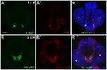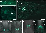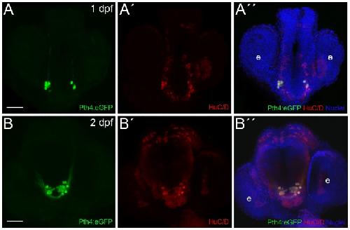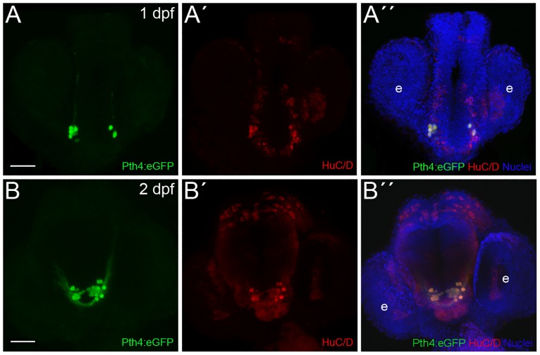 Fig 2. Zebrafish Pth4:eGFP-expressing cells are post-mitotic neurons.Double inmunostaining in Pth4:eGFP transgenic embryos using anti-eGFP antibody (A and B) and anti-HuC/D antibody (A´and B´) shows complete co-localization at 1 and 2 dpf (A´´ and B´´). Ventral views with anterior to the top. Pth4:eGFP: green; HuC/D: red; nuclear stain: blue. Abbreviation: e, eye. Scale bar: 50 μm.