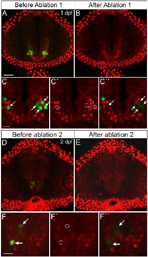 Fig 3. Two-photon laser ablation of Pth4:eGFP-expressing cells at 1 dpf and 2 dpf.Before ablation 1 and 2, Pth4:eGFP+/Bactin2:H2A-mCherry+ transgenic embryo shows two bilateral clusters of neurons in the hypothalamic area (A and D). After several rounds of ablation the eGFP-expressing cells are completely eliminated (B and E). Ablation processes example (C-C´´and F-F´´): (C and F) arrows indicate eGFP-expressing cells chosen for ablation; nuclear region of interest for targeted elimination of Pth4:eGFP neurons is defined by circles, based on red fluorescence from nuclear marker Bactin2 (C´ and F´); immediately after ablation Pth4:eGFP neurons are eliminated (marked by arrows in C´´ and F´´). Note that the untargeted cells around the eGFP-expressing cells ablated are intact (C´´ and F´´). A confocal z-stack projection (A, B, D and E) or single 2 μm thick z-plane slice (C-C´´ and F-F´´) are shown. Scales bars: 50 μm (A, B, D and E); 15 μm (C-C´´ and F-F´´).