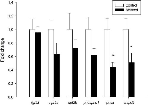 Fig 6. Mineralization and phosphate metabolism markers are altered post-ablation.qRT-PCR on 7 dpf larvae shows significant down-regulation of phex (**p<0.025) and entpd5 (*p<0.05) expression in ablated larvae (black bars) compared with controls (white bars). Results normalized to actb1 are expressed as mean ± SEM.