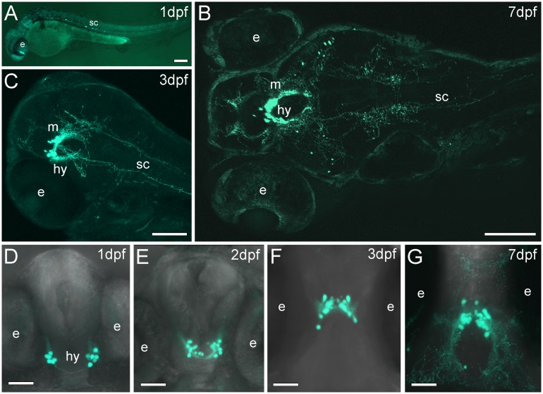 Fig 1. Stable transgenic Pth4:eGFP zebrafish line shows eGFP-expressing cells through development.Whole mount confocal imaging showing eGFP-expressing cells and axonal projections at 1, 3 and 7 dpf (A, B and C). Confocal z-stack projection showing two clusters of Pth4:eGFP-expressing cells on the lateral hypothalamus in a ventral view (D, E and F) or dorsal view (G). The total number of eGFP cells was measured by analyzing each 2μm thick z-plane slice from the full confocal z-stack projection in each stage of development: (D) 14±2 eGFP cells at 1dpf, (E) 22±2 eGFP cells at 2dpf, (F) 29±2 and (G) 33±1 eGFP cells at 3 and 7dpf, respectively). Note that the number of cells increases over time and axonal projections become more abundant and branched (B, G). Two groups of Pth4:eGFP-expressing cells move gradually from a caudo-ventral to a more rostro-dorsal position. Abbreviation: e, eye; hy, hypothalamus; m, midbrain; sc, spinal cord. Scale bars: 100 μm (A-C) 50 μm (D-G).