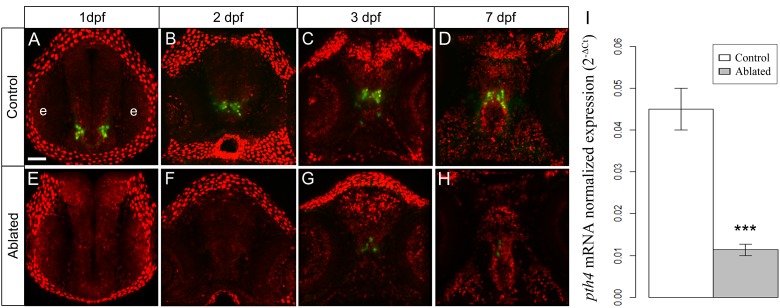 Fig 4. Illustration showing the development of the two clusters of Pth4:eGFP neurons in control (A-D) and ablated larvae (E-H) from 1 to 7 dpf.After first and second round of ablation, 1 and 2 (at 1 and 2 dpf, respectively) the eGFP-expressing cells are totally eliminated (E and F); at 3 dpf and 7 dpf a low number of Pth4:eGFP-expressing neurons recover (G-H), but there remains significantly decreased pth4 gene expression (***p< 0.001) in 7 dpf ablated larvae (I). Results normalized to actb1 are expressed as mean ± SEM. Confocal z-stack projections are shown. Abbreviation: e, eye. Scales bars: 50 μm.