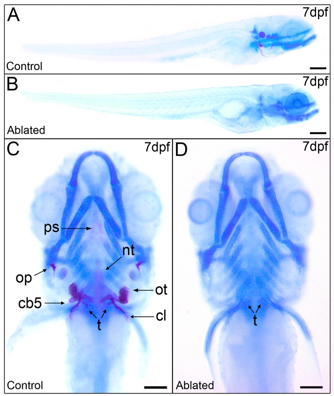 Fig 5. Ablated larvae exhibit impaired mineralization of the craniofacial skeleton but normal cartilage development.Skeletal staining in 7 dpf control larvae (A and C) shows calcification of the craniofacial bones unlike ablated larvae (B and D) with a widely non-mineralized skeleton except an incipient mineral deposit on teeth. Lateral views (A and B) and ventral views (C and D). Abbreviations: ps, parasphenoid; nt, notochord tip; op, operculum; ot, otolith; cb5, ceratobranchial arch 5; t, teeth; cl, cleithrum. Scale bars: 100 μm.
