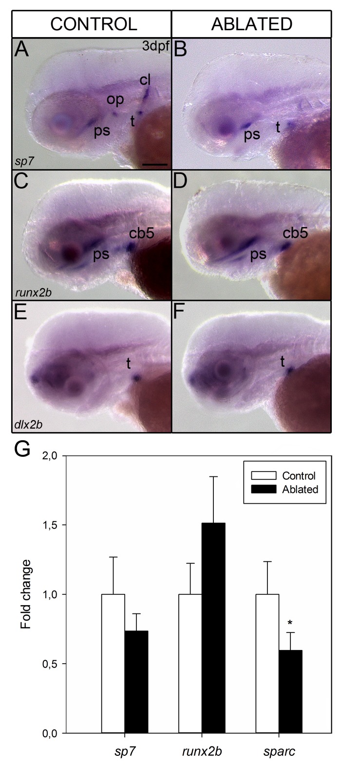 Fig 7. Whole mount in situ hybridization shows the gene expression pattern of osteoblast differentiation markers at 3 dpf in control (A, C and E) and ablated larvae (B, D and F) from lateral view.Expression of sp7 is detected in operculum, cleithrum, teeth and parasphenoid (A). Note the absence of expression in cleithrum and operculum in ablated larvae (B). runx2b and dlx2b display the same expression pattern before ablation (C, E) and after ablation (D, F). Quantitative RT-PCR analysis of early (runx2b), intermediate (sp7) and late (sparc) stage markers of osteoblast differentiation in 7 dpf ablated (black bars) and control larvae (white bars) (G). Results show significant down-regulation of sparc gene expression (*p <0.05) when compared with controls. Results normalized to actb1 are expressed as mean ± SEM. Abbreviations: ps, parasphenoid; op, operculum; cb5, ceratobranchial arch 5; t, teeth; cl, cleithrum. Scale bars: 100 μm.