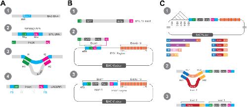 Figure 3. Double recombineering strategy to localize enhancers in large genomic regions. (A) Overview of recombineering procedure. A target region for insertion is selected in the BAC, for example the first coding exon of the gene of interest containing the start codon (ATG) (1). An insert (containing an antibiotic resistance gene and possibly other elements such as a reporter gene) with appropriate homology arms (H1, H2) complementary to BAC target sequences is transformed into bacteria containing the BAC (2). The insert is inserted into the BAC by homologous recombination (recombineering) replacing the original BAC sequence between H1 and H2 (3). Proper insertion is verified by PCR using forward (FB) and reverse primers (RB) for BAC sequences flanking the insertion, while proper orientation is verified by PCR combining FB with a reverse primer for an insert specific sequence (RI) or a forward primer for an insert specific sequence with RB (4). (B) Creation of reporter BACs in the first recombineering step. Insert 1 (here the insert for BAC15) contains an ampicillin resistance gene and a GFP reporter gene (1). Homology arms are designed to target the insert to a position immediately after the start codon in the first coding exon of Eya1 during recombineering (2). BAC reporter construct after recombineering (3). (C) Creation of deletion constructs of BAC reporters in the second recombineering step. Sequences flanking large noncoding regions in the BAC are selected as new homology arms (HD1-HD5). Chosing different combinations of these for the insert 2 (containing a kanamycin resistance gene) will result in deletions of different extent (1). During recombineering the sequence D4 on the BAC between HD1 and HD2 (or between other homology arms chosen) will be deleted and replaced by the kanamycin resistance cassette (2). BAC reporter deletion construct after second step of recombineering containing insert 1 and 2 (3).