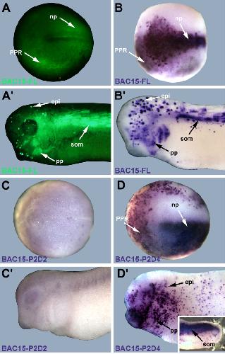 Figure 4. GFP reporter expression driven by BAC15. Embryos of Xenopus laevis at neural plate (AâD: dorsal view, anterior to the left) and tailbud stages (AââDâ: lateral view, anterior to the left) after injection with BAC15 reporter constructs at the one-cell stage. A,Aâ,B,Bâ: GFP expression after injection of full length BAC15 reporter (BAC15-FL) in living Xenopus embryos (A,Aâ) or as revealed by GFP in situ hybridization (B,Bâ). C,Câ: Absence of GFP expression domains after injection of BAC15-P2D2 deletion construct. D,Dâ: GFP expression domains after injection of BAC15-P2D4 deletion construct recapitulate those observed after BAC15-FL injection. Insert in Dâ shows somitic expression in trunk region of a different embryo (tail end to the right). Abbreviations: epi: epidermis; np: neural plate; pp: pharyngeal pouches; PPR: preplacodal region; som: somites.