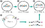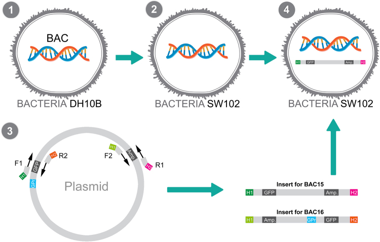 Figure 2. Overview of procedure for generating BAC15 and BAC16 reporter constructs. BACs were obtained from a BAC library maintained in the DH10B strain of E. coli (1). BACs were then purified and transformed into strain SW102 (or EL250; not shown) competent for recombineering (2). Primers with overhangs complementary to the targeted BAC region (homology arms H1 and H2) were used to amplify a cassette containing the GFP reporter and an ampicillin resistance gene (Amp) from plasmid pIS-GATA2-GFP using PCR. The insert amplified with primers F1 and R1 was used for BAC15 and did not contain a promoter, whereas the insert amplified with primers F2, R2 was used for BAC16 and contained the GATA2 minimal promoter (3).The insert was transformed into SW102 bacteria containing the appropriate BAC to allow for recombineering (4).