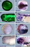 Figure 5. GFP reporter expression driven by BAC16. Embryos of Xenopus laevis at neural plate (AâD: dorsal view, anterior to the left) and tailbud stages (AââDâ, Aâ,Bâ: lateral view, anterior to the left) after injection with BAC16 reporter constructs at the one-cell stage. AâAâ, BâBâ: GFP expression after injection of full length BAC16 reporter (BAC16-FL) in living Xenopus embryos (AâAâ) or as revealed by GFP in situ hybridization (BâBâ). C,Câ: Absence of GFP expression domains after injection of BAC16-P2D3 deletion construct. D,Dâ: GFP expression domains after injection of BAC16-P2D4 deletion construct recapitulate those observed after BAC16-FL injection. Insert in Dâ shows somitic expression in trunk region of a different embryo (tail end to the right). Abbreviations: epi: epidermis; le: lens placode; ll: lateral line placodes; np: neural plate; olf: olfactory placode; ot: otic placode/vesicle; pp: pharyngeal pouches; PPR: preplacodal region; som: somites.