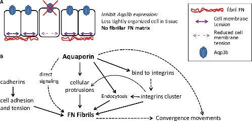Models for the mechanisms by which Aqp3b may affect fibrillar FN matrix assembly. (A) We have shown that knockdown of Aqp3b expression (indicated by red X) caused cells to be less well organized, particularly at the tissue boundary between mesendoderm and ectoderm in Brachet's cleft in the dorsal marginal zone. This resulted in cell autonomous loss of the fibrillar FN matrix in Brachet's cleft. Cells with unaffected Aqp3b formed normal fibrillar FN matrix. (B) Aqp3b may influence fibrillar FN matrix formation by several mechanisms. Membrane protrusions are important for cell-mediated FN fibril assembly (Davidson et al., 2008) and Aqps have been localized to the leading edge of cell protrusions (Saadoun et al., 2005). Further, integrin clustering is essential for FN fibril assembly (Wu., et al., 1993), and Aqps have been shown to bind to the β1 integrin subunit, which is required for integrin endocytosis (Chen et al., 2012). Endocytosis of the α5β1 integrin receptors is necessary for FN fibril assembly (Spicer et al., 2010). Tension imparted by cadherins is required for fibrillar FN matrix formation (Dzamba et al., 2009), which has not yet been shown to be affected by aquaporins. Finally, Aqp3b may engage in cellular signaling to influence fibrillar FN matrix formation, and Aqp3 overexpression was found to upregulate FN expression in cancer cells (Chen et al., 2014). Finally, Aqp3b appears to be required for normal convergence movements during gastrulation, which may be fibrillar FN matrix-dependent or –independent. Solid arrows: relationships that have been documented; dashed arrows: possible relationships or alternate pathways.