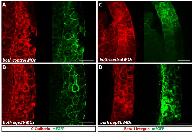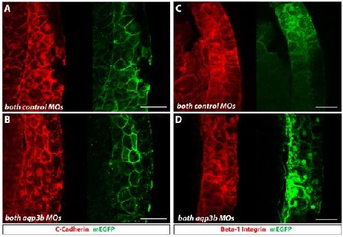 Figure S2. C-Cadherin and ï¢1-integrin expression was not affected in aqp3b morphants. Embryos were co-injected with both aqp3b MOs or both control MOs and then stained with either C-cadherin (A, B) or ï¢1-integrin (C, D) antibodies (both red) at stage 11. The companion images indicate the presence of the MOs by staining for the mEGFP tracer (green). Inhibition of Aqp3b translation changed neither C-cadherin (B) nor ï¢1-integrin (D) levels. Scale bars: 50 um.