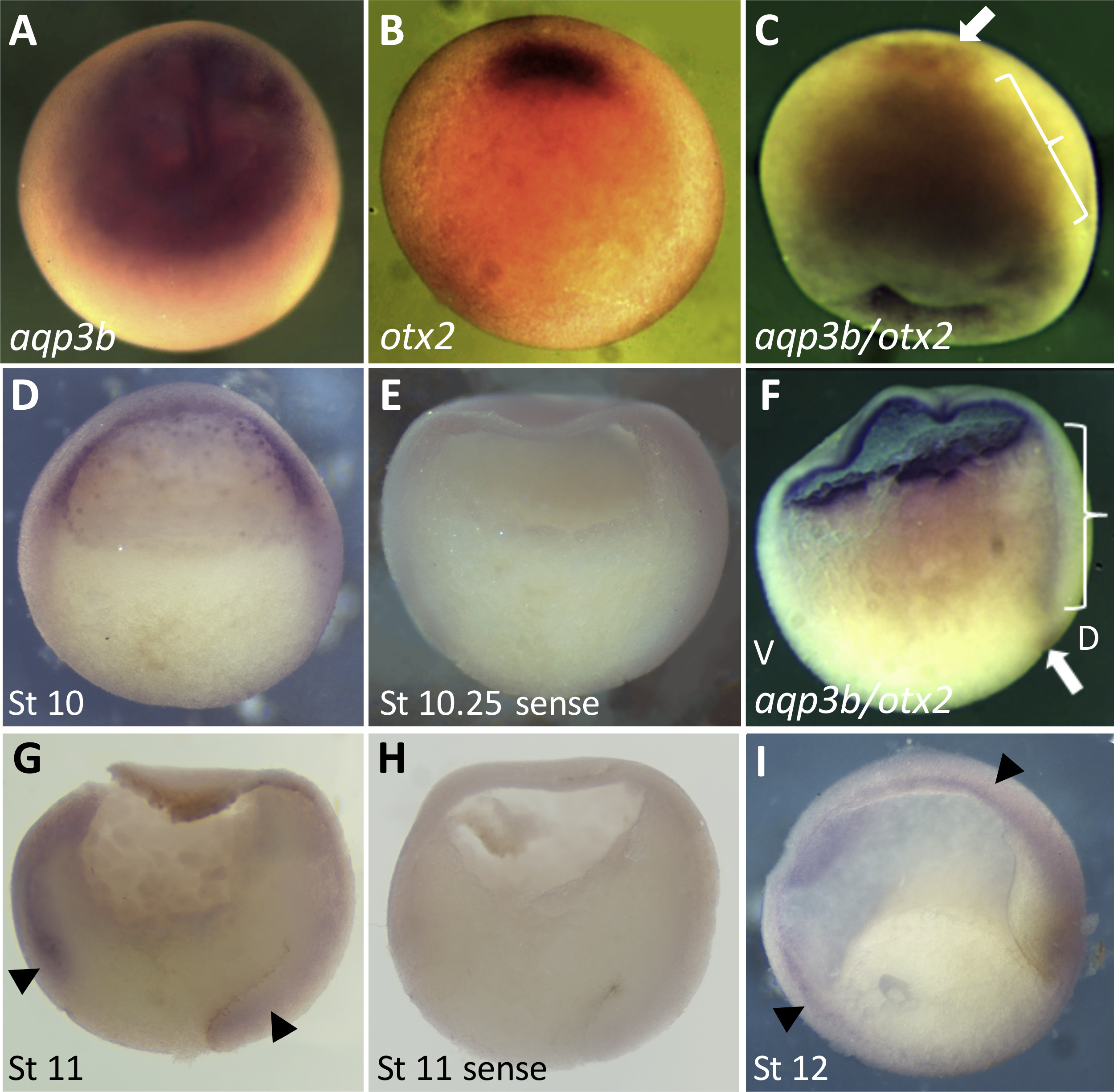 aqp3bis expressed in the marginal zones of gastrula embryos. aqp3b expression was characterized by in situ hybridization in gastrula Xenopus embryos. (A-C) Animal pole views of aqp3b expression in stage 10.5 embryos. Expression of aqp3b was strong in the entire animal cap (A) and otx2 expression marks the dorsal lip of the blastopore (B). (C) Double in situ hybridization showed aqp3b (bracket) and otx2 (arrow) expression. The aqp3b expression domain extended to the region of otx2 expression. (D-I) Hemisected embryos. (D) aqp3b is expressed in the sensorial layer of the blastocoel roof and in the marginal zones at early gastrula stage 10. (F) aqp3b expression (bracket) extends to the dorsal lip of the blastopore (marked by otx2, arrow; stage 10.25 embryo). The strong staining lining the blastocoel was also present in otx2 single in situ hybridizations and therefore due to the otx2 probe (not shown). Stage 11 (G) and stage 12 (I) embryos showed diminishing levels of aqp3b expression in involuted mesoderm (arrowheads). In situ hybridization with aqp3b sense probe demonstrated low levels of background in the areas of interest (E, H). Remnants of brown pigment are due to the use of bleached wild type embryos. The dorsal lip of the blastopore is at the top in (A-C) and to the right in (D-I). D, dorsal; V, ventral.