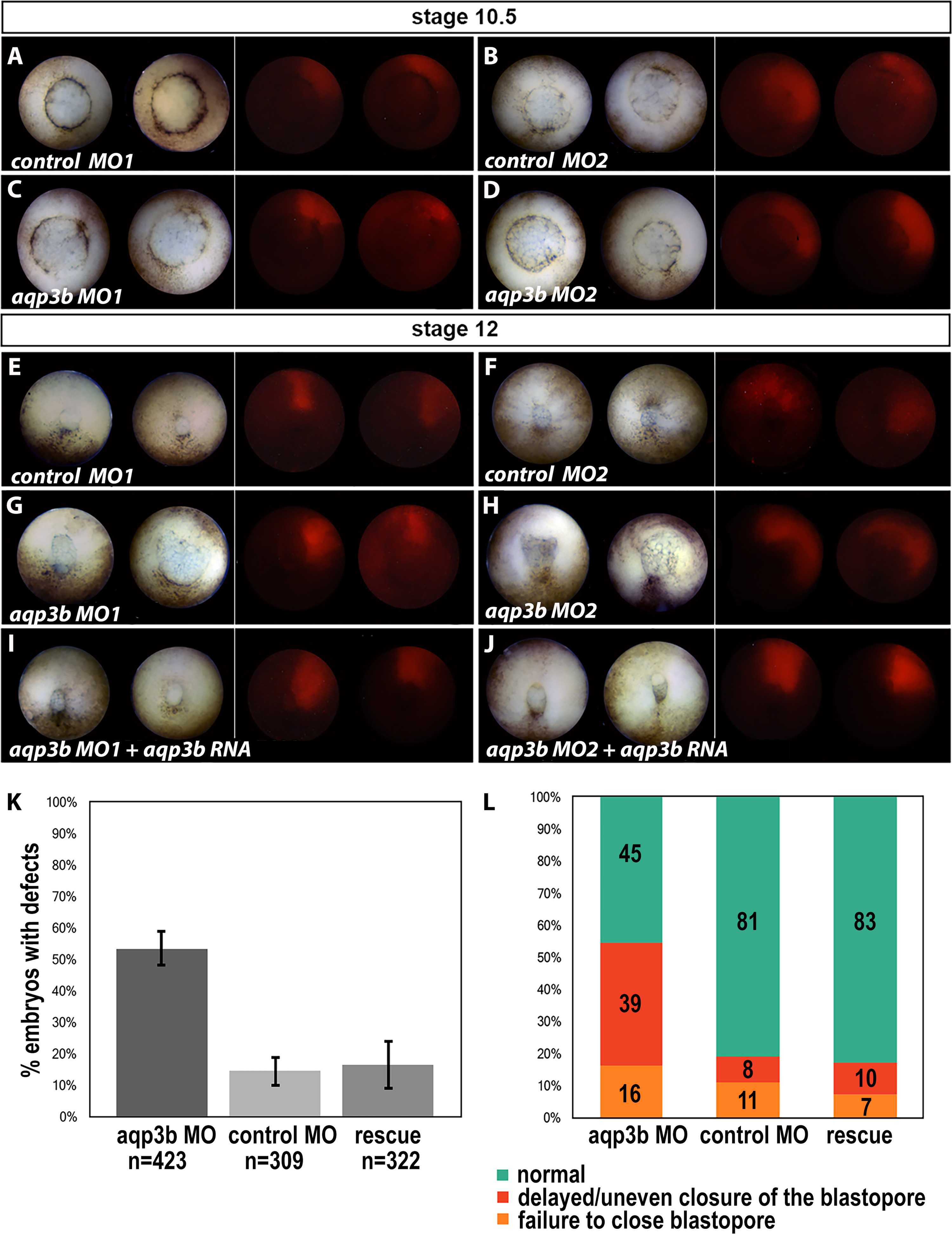 Knockdown ofaqp3bresults in defects during gastrulation.Xenopus embryos were pre-injected at the 1-cell stage with lacZ RNA (injection control) (A-H) or aqp3bMM RNA, which is not recognized by either aqp3b MO (I, J). At the 4-cell stage, the embryos were additionally injected into one dorsal blastomere with control MO1 (A, E), aqp3b MO1 (C, G, I), control MO2 (B, F), or aqp3b MO2 (D, H, J) together with the injection tracer rhodamine-dextran. (Each embryo set is paired with the corresponding fluorescent images.) Blastopore closure proceeded normally in control MO-injected embryos (A, B, E, F). aqp3b MOs did not have gross effects on early blastopore closure in stage 10.5 embryos (C, D), but clear defects developed by stage 12 (G, H), which were rescued by aqp3bMM RNA (I, J). (K) Percentage of embryos showing gastrulation defects at stage 12 (injection as above with aqp3b MOs, control MOs, or rescue of aqp3b MO defects with aqp3bMM RNA). Error bars represent standard error of the mean. Seven independent clutches were scored with a total number of embryos as indicated. (L) In four independent experiments, 40â90 embryos were scored per clutch for the types of phenotypic defects resulting from aqp3b MO1 injection and rescue, compared to control MO1 injections.