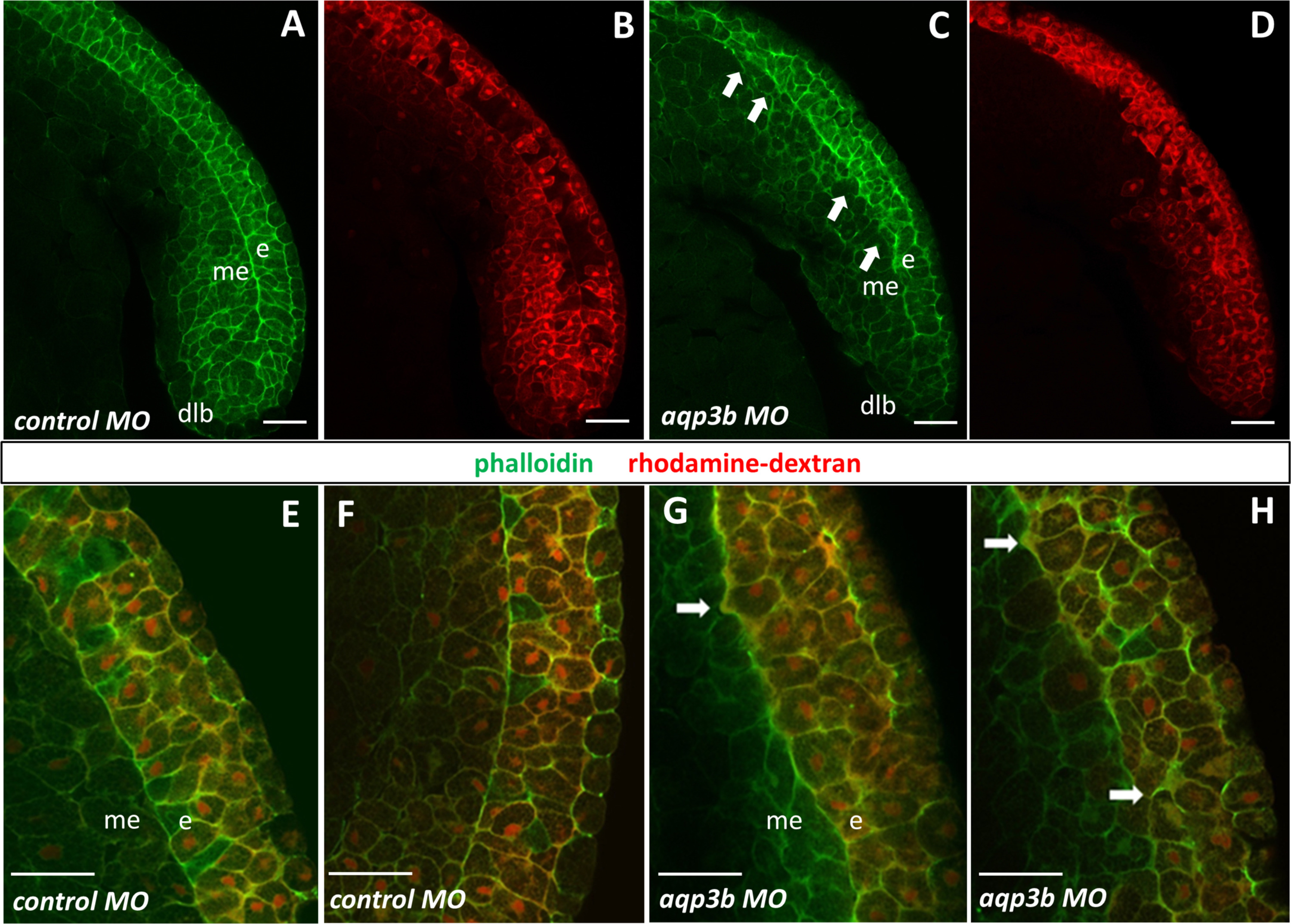 Impairedaqp3bexpression results in abnormal tissue architecture.aqp3b MO1-injected embryos (stage 10.5) were analyzed by confocal microscopy to visualize phalloidin (green) and co-injected rhodamine-dextran tracer (red). Embryos that received control MO1 in their dorsal marginal zone (A, B) showed a highly organized boundary between ectoderm (e) and mesendoderm (me), which was revealed by actin cytoskeletal staining (A). In contrast, aqp3b MO1-injected embryos (C, D) displayed irregularities in this boundary and jagged protrusions were found along the ectoderm layer (arrows, C). In higher magnification images, control MO1-injected embryos (E, F) showed highly organized tissue architecture and regularly shaped cells, while in aqp3b MO1-injected embryos (G, H), the ectoderm/mesendoderm boundary was irregular and cells seemed less tightly packed (arrows). dlb, dorsal lip of the blastopore; e, ectoderm; me, mesendoderm. Scale bars: 50um.