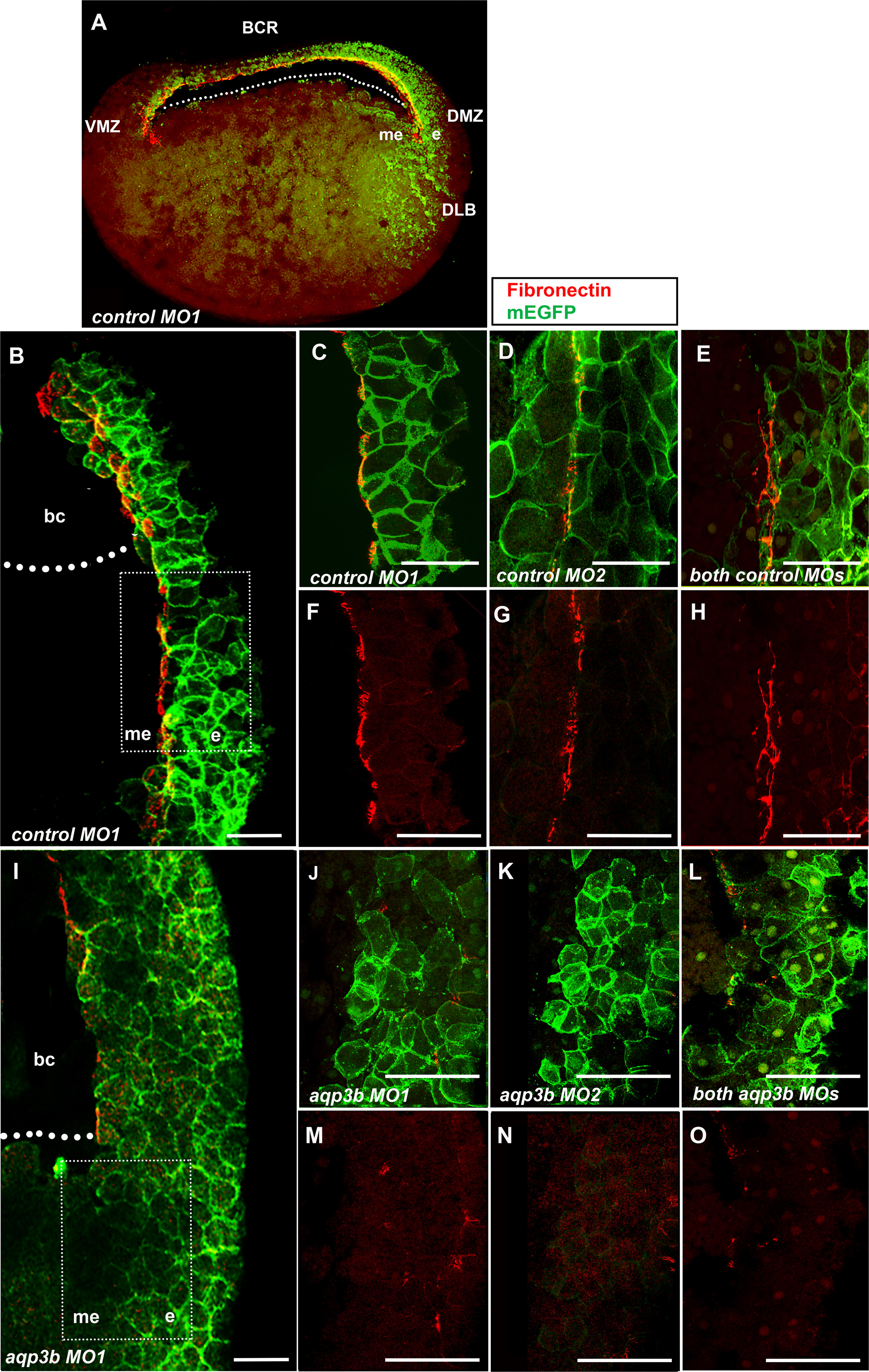 The fibronectin (FN) matrix is defective next to cells with compromisedaqp3bexpression within the DMZ. Gastrula embryos (stage 10.5) that had been co-injected with MOs and membrane-bound mem-EGFP tracer RNA (green) were hemisected sagittally through the dorsal blastopore lip, stained with FN antibodies (red), and evaluated by confocal microscopy. (A) In a control MO1-injected gastrula embryo, the FN matrix extended along the inner surface of the blastocoel roof and into the dorsal and ventral marginal zones. (B-H) Control MO-injected embryos had an uninterrupted FN matrix. The dashed box in the lower magnification image (B) indicates the area shown in (C, F) from a different optical plane. Continuous FN matrix was also present in embryos injected with control MO2 (D, G) and both control MOs (E, H). The green channel (mem-EGFP) was omitted in the lower panels to clearly show the extent of the FN matrix (red), which was continuous between non-involuted ectoderm and involuted mesendoderm. (I-O) aqp3b morphants showed interruption of the FN matrix wherever aqp3b MOs were present (marked by green mem-EGFP tracer). The dashed box in (I) shows an equivalent area as in (J, M). In the area sandwiched between ectoderm and mesendoderm, the fibrillar FN matrix is highly disrupted by the presence of aqp3b MO1 (I, J, M), aqp3b MO2 (K, N), and synergistically in embryos injected with lower amounts of both aqp3b MOs (L, O). DMZ, dorsal marginal zone; VMZ, ventral marginal zone; BCR, blastocoel roof; DLB, dorsal blastopore lip; e, ectoderm; me, mesendoderm; bc, blastocoel cavity; the dotted lines demarcate the floor of the blastocoel. Scale bars: 50 um.