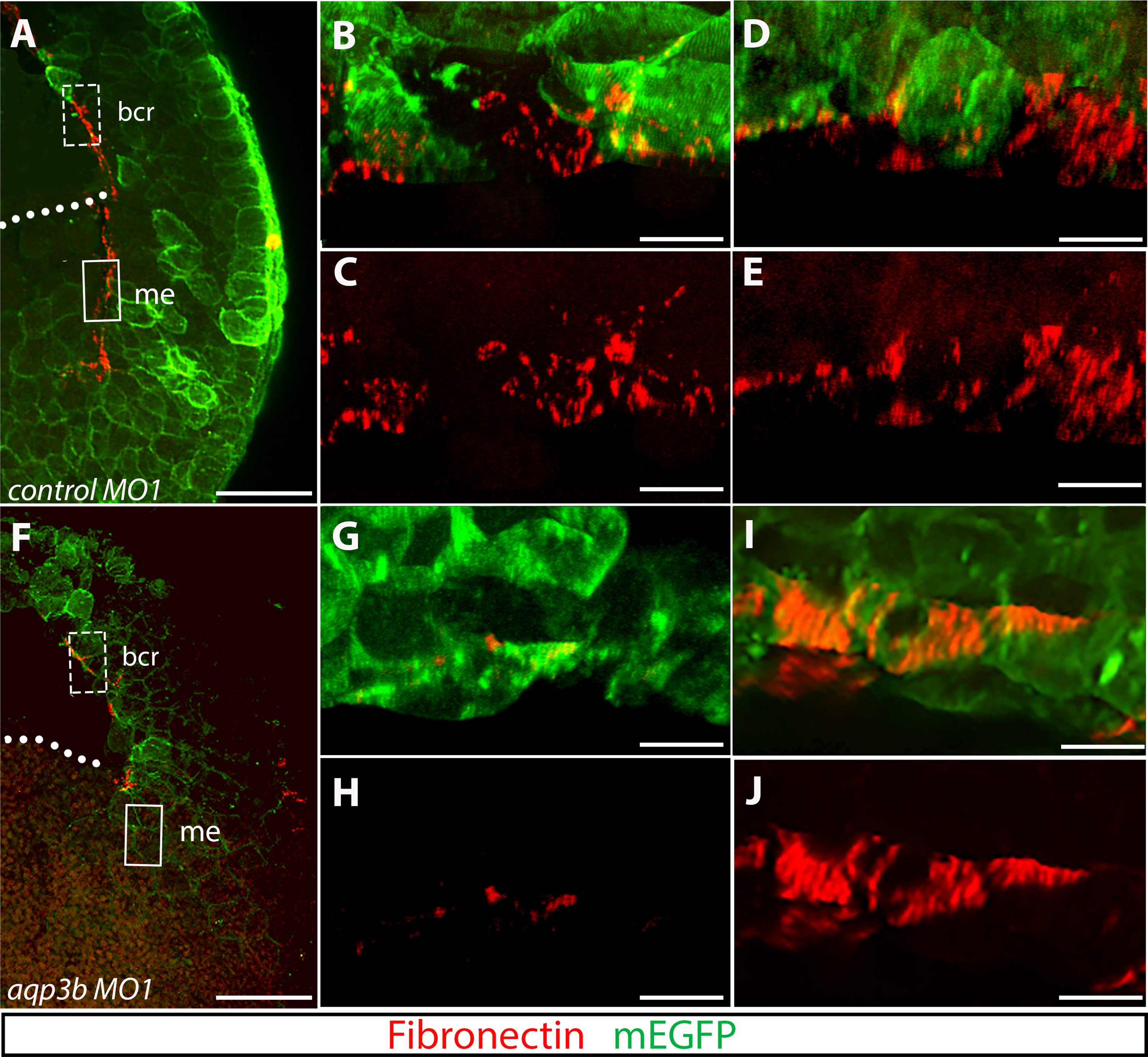 Cells with disruptedaqp3black a continuous fibrillar FN matrix across the face of the ectoderm. Confocal image stacks of hemisected embryos were rotated to show the surface of ectoderm cells (B-E, G-J). Control MO1-injected embryos (A-E) showed an extensive fibrillar FN matrix across the face of the ectoderm in Brachet's cleft (B, C) and along the BCR (D, E). aqp3b MO1-injected embryos (F-J) were nearly devoid of fibrillar FN matrix across the face of the ectoderm in Brachet's cleft (G, H), but did possess FN matrix lining the face of the BCR (I, J). The boxes in (A) and (F) indicate the areas that were used for the rotated projections (dashed box = BCR: B, C, G, H, and solid box = Brachet's cleft: D, E, I, J). The green channel was removed in (C, E, H, J). The dotted lines delineate the floor of the blastocoel. Scale bars: (A, F) 100 um; (B-E, G-J) 10 um.