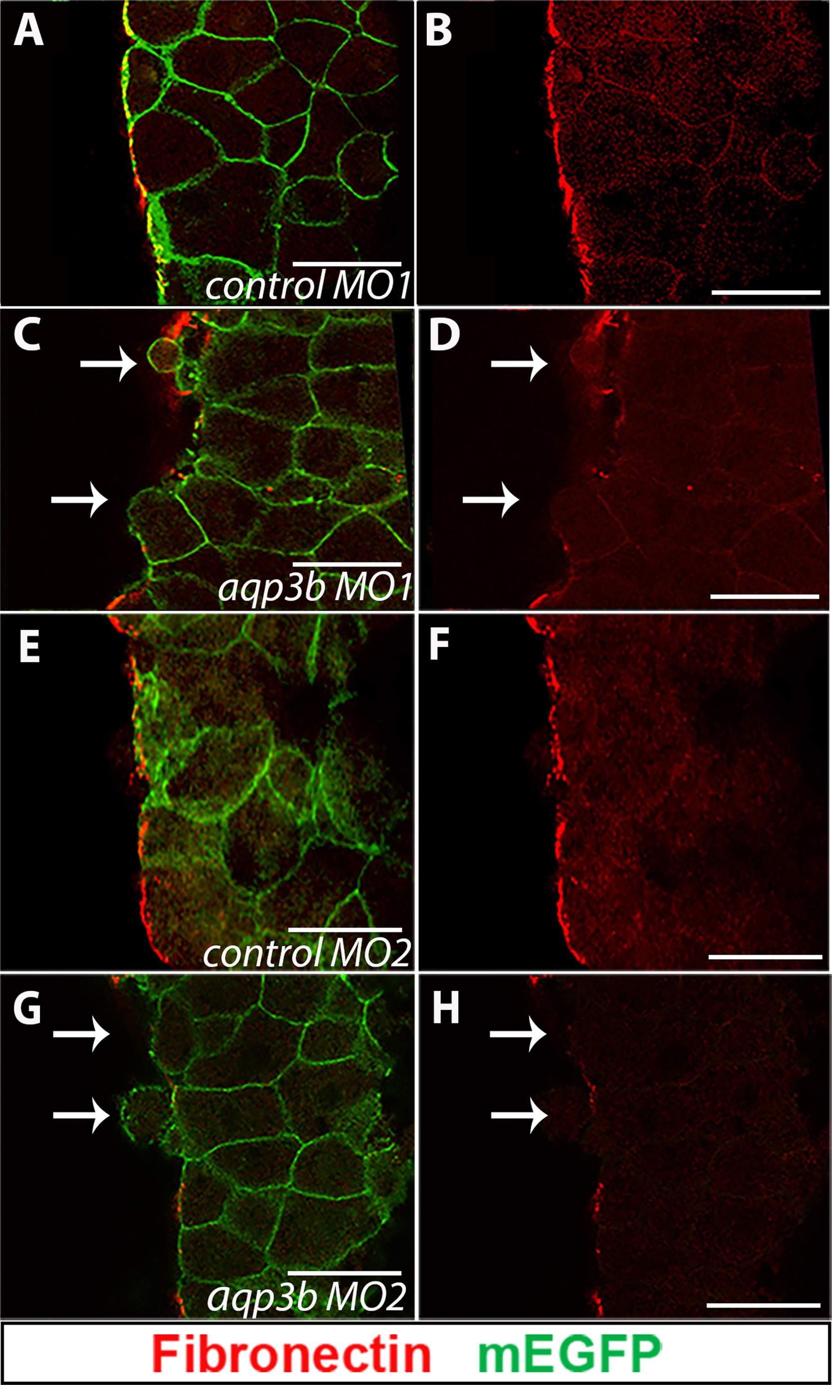 Embryos that receivedaqp3bMO localized non-fibrillar FN matrix around all cells. Embryos co-injected with both aqp3b MOs (4 ng each) lacked a continuous fibrillar fibronectin (FN) matrix (C, D) but exhibited the same level of pericellular FN matrix (arrowheads) as control MOs-injected cells (A, B), suggesting that the presence of non-fibrillar FN was not affected by the absence of Aqp3b. Asterisks in (C-F) mark cells that did not receive aqp3b MOs in otherwise aqp3b MOs-injected embryos. These cells had adjacent fibrillar FN matrix (white arrows), unlike neighboring cells, which received aqp3b MOs and where the fibrillar FN matrix was lacking. Scale bars: 10 um.