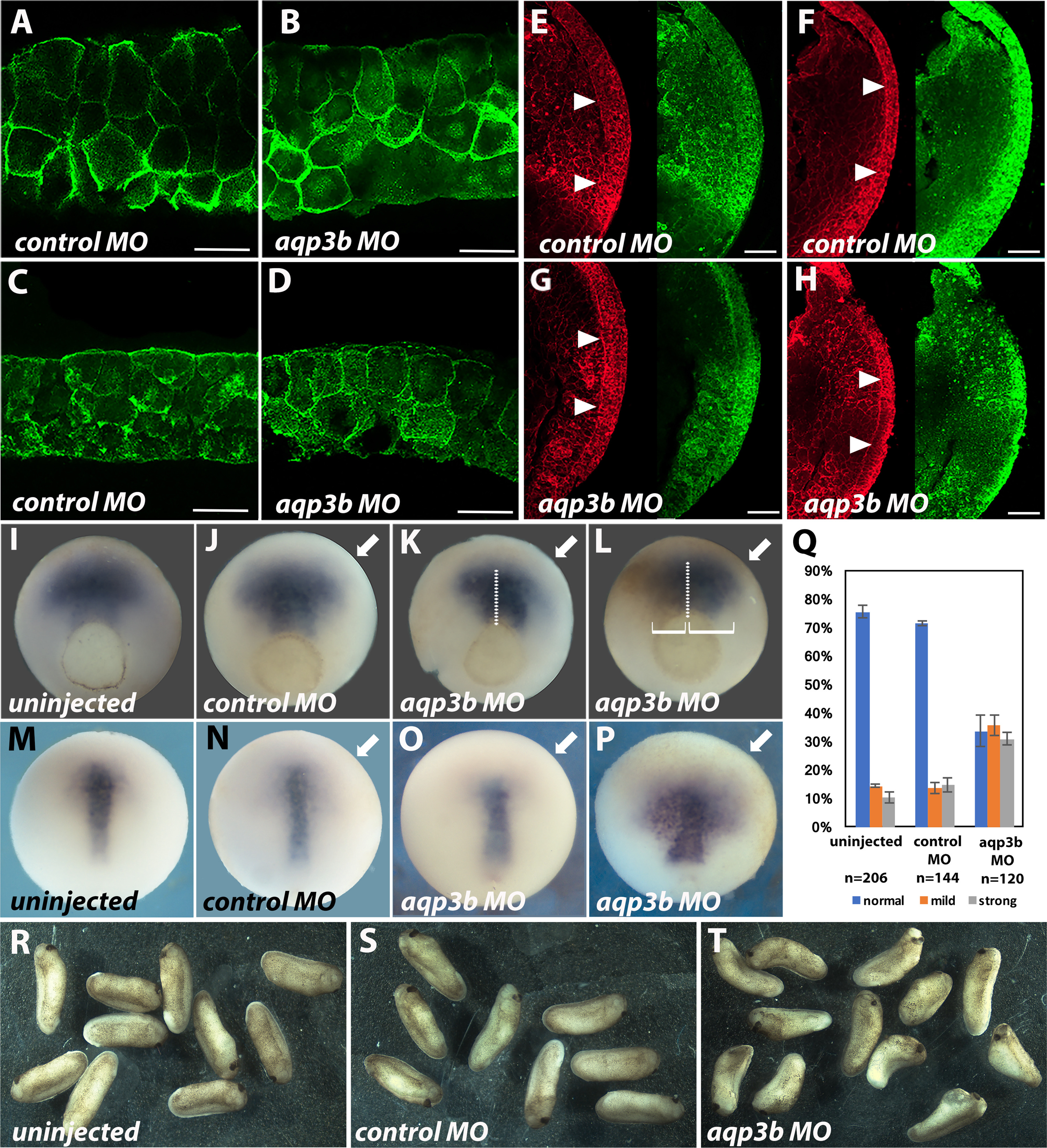 Convergence but not radial intercalation movements were affected in embryos that receivedaqp3bMO. Embryos co-injected with both aqp3b MOs (B, D) showed equal thinning of the blastocoel roof as embryos that received both control MOs (A, C); stage 9 (A, B), stage 11 (C, D). Similarly, stage 11â11.25 embryos injected with control MOs (E, F) or with aqp3b MOs (G, H) showed equally thinned DMZs (arrowheads), indicating normal radial intercalation. Embryos were stained with antibodies against β-catenin (red) to outline cells (E-H) and with anti-EGFP antibodies (green) to indicate areas that received the aqp3b MOs (A-H). In situ hybridization with chordin probe of mid-gastrula embryos (stage 11; I-L) and after completion of gastrulation (stage 13; M-P) demonstrated that uninjected (I, M) and control MOs-injected (J, N) embryos showed normal convergent extension movements. Wider chordin expression patterns in aqp3b MOs-injected embryos (K, L, O, P) were consistent with defects in convergence movements. The defects ranged from mild (O) to strong (P), which is quantified in (Q). Four independent batches were scored with a total number of embryos as indicated. Tailbud embryos (R-T) showed shortened body axes when injected with aqp3b MOs (T). Arrows indicate the injected sides of the embryos. The embryo in (L) contained remnants of wild type pigment. Thus, brackets indicate the extent of chordin expression. Scale bars: 25 um (A-D); 100 um (E-H).