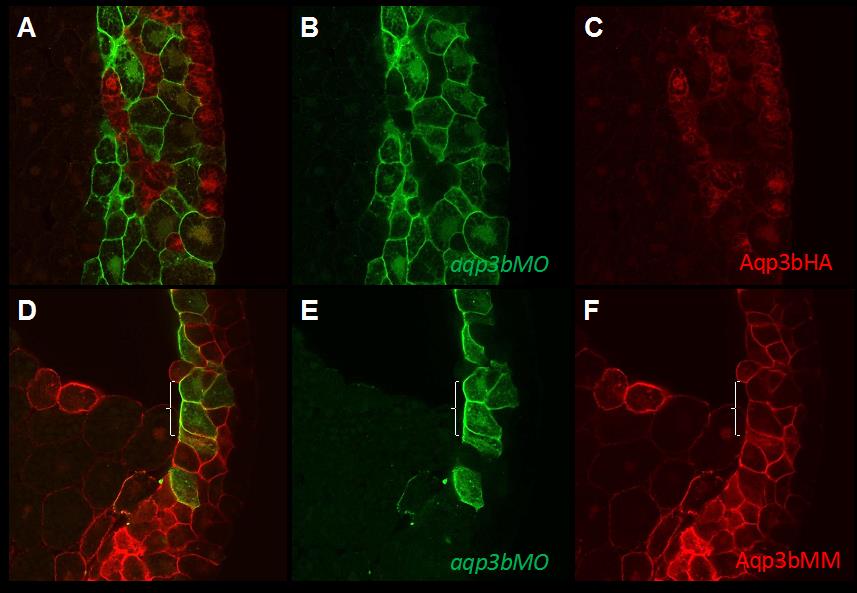 Figure S1. aqp3b MO prevents Aqp3b translation. Embryos were pre-injected at the 1-cell stage with either HA-tagged aqp3b sense RNA (aqp3bHA; panel A) or with aqp3bMM sense RNA (D). These pre-injected embryos were then co-injected with aqp3b MO1 and mEGFP tracer into one cell at the 4-cell stage. Antibody staining showed that aqp3b MO1 was able to inhibit aqp3bHA RNA translation (A-C), but that translation of aqp3bMM RNA proceeded undisturbed (D-F). The bracket indicates a region of aqp3b MO1 and Aqp3bMM overlap.