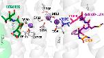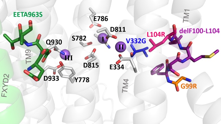 Figure 1. Location of hyperaldosteronism mutations. Zoomed-in view of the ion-binding sites in the E1(3Na) pig Na/K pump structure (Protein Data Bank accession no. 2ZXE) indicating several ion-coordinating residues. The three Na+ ions bound are shown in purple, and the carbon backbone of residues altered by hyperaldosteronism-associated Na/K pump mutations studied here is the same color scheme used for each mutant throughout the article.