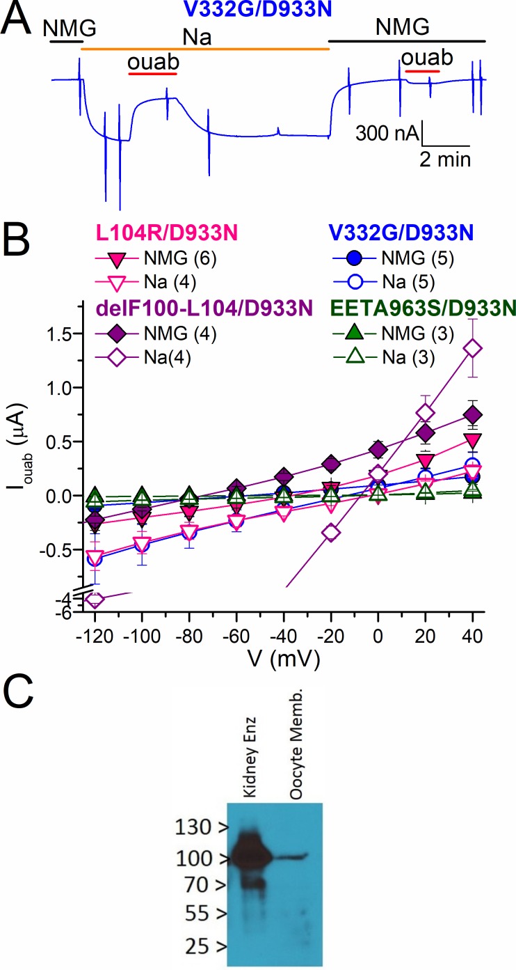 Figure 3. Effect of D933N on the mutants’ leak currents. (A) Continuous TEVC recording at −50 mV from an oocyte expressing V332G/D933N. (B) Mean Iouab in NMG+o (filled symbols) and Na+o (open symbols) for double mutants L104R/D933N (down triangles), V332G/D933N (circles), delF100-L104/D933N (diamonds), and EETA963S/D933N (up triangles), recorded 3–4 d after injection. Note axis break at negative currents caused by larger currents in oocytes expressing delF100-L104/D933N. The number of experiments is indicated in parentheses. Error bars represent SEM. (C) Western blot of protein recognized by the Anti-KETYY antibody targeting the C-terminal end of the Na/K-ATPase. Left lane shows purified sheep kidney enzyme (0.5 µg total protein) and a membrane preparation from 25 oocytes injected with Xenopus RD-α1-EETA963S/D933N cRNA (20 µg total protein). Bands at ∼110 kD (the approximate mass of the Na/K-ATPase α-subunit) are visible for both samples.