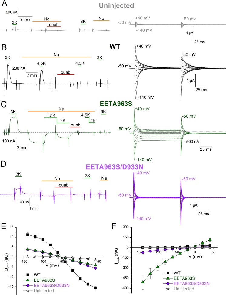 Figure 4. Wild-type, EETA963S, and EETA963/D933N human pumps. (A–D) Representative current recordings from Na+o-loaded oocytes that were uninjected (A) or injected with human Na/K pump cRNA encoding wild type (B), EETA963S (C), or EETA963S/D933N (D). Left traces show a continuous recording illustrating the effect of several experimental maneuvers on holding current at −50 mV. In all four cases, initial application of K+ in NMG+o activated outward current. Substitution of NMG+o with Na+o induced inward current only in EETA963S. For wild type and EETA963S, 4.5 mM K+ applied in Na+ activated a large outward current. Note that after a 2-min application of 1 mM ouabain, there is no response to subsequent application of K+ in all cases, and that the inward current through EETA963S is irreversibly blocked. Right traces show ouabain-sensitive currents measured in Na+o in the same oocytes shown on the left, evoked by application of 100-ms-long pulses to voltages between −140 and 40 mV in 20-mV increments. Gray dashed lines indicate zero-current level. (E) Mean Q-V curves from uninjected (stars, n = 7), wild-type–injected (squares, n = 5), EETA963S-injected (up triangle, n = 4), and EETA963S/D933N-injected (circles, n = 5) oocytes. (F) Mean ouabain-sensitive, steady-state currents in Na+o for same conditions and oocytes in E. Error bars represent SEM.