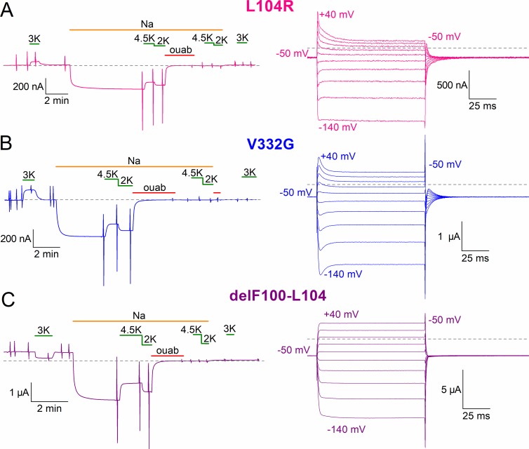 Figure 5. L104R, V332G, and delF100-L104 human pumps. (A–C) Representative current recordings from Na+-loaded oocytes, expressing L104R (A), V332G (B), and delF100-L104 (C). Left traces show the effect on holding current at −50 mV of the same experimental maneuvers shown in Fig. 4 C. Right traces show voltage pulse-evoked ouabain-sensitive currents in Na+ solution from the same oocytes shown on the left. Gray dashed lines indicate zero-current level.