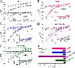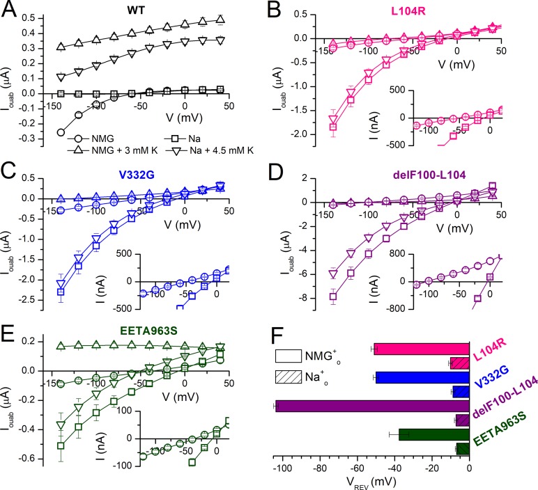 Figure 6. Ouabain-sensitive currents in wild-type and mutant human Na/K pumps. (A–E) Mean ouabain-sensitive I-V plots in different ionic conditions from oocytes expressing wild-type (n = 5; A), L104R (n = 5; B), V332G (n = 5; C), delF100-L104 (n = 5; D), and EETA963S (n = 4; E) pumps, recorded 2–4 d after injection in experiments similar to those in Figs. 4 and 5. Shown are ouabain-sensitive currents in NMG+o (circles), NMG+o + 3 mM K+o (up triangles), Na+o (squares), and Na+o + 4.5 mM K+o (down triangles; symbol key in A). The insets in B–D show a zoomed-in view of the axes to illustrate the shift in reversal potential (VREV) when Na+o was replaced with NMG+o. (F) Mean reversal potential of ouabain-sensitive currents in NMG+o (solid bars) and Na+o (striped bars). Error bars represent SEM.