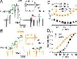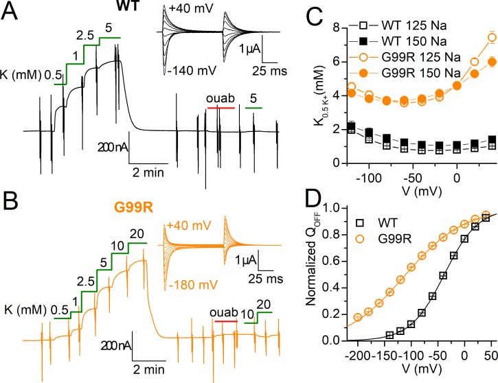 Figure 8. K+o dependence of wild-type and G99R pumps. (A and B) TEVC recordings at −50 mV from representative oocytes 4–5 d after injection with wild-type (A) or G99R (B) cRNA. Application of K+o in Na+o solution stimulated outward current in a [K+o]-dependent manner. Addition of 10 and 20 mM K+o did not activate outward current after application and withdrawal of 1 mM ouabain. Insets in A and B are the expanded time-scale ouabain-sensitive transient currents in Na+o upon 100-ms voltage steps from −50 mV. (C) Mean K0.5 for K+o, as a function of voltage, for wild type (squares) and G99R (circles), measured in 125 mM Na+o (open symbols) or 150 mM Na+o (solid symbols). Wild type at 125 mM Na+o (n = 6) and at 150 mM Na+o (n = 4); G99R at 125 mM Na+o (n = 3) and at 150 mM Na+o (n = 8). (D) Mean normalized Q-V curves in 125 mM Na+o for wild type (squares, n = 7) and G99R (circles, n = 6). Line plots represent a Boltzmann with parameters in the text. Error bars in C and D are SEM, smaller than the symbols for most data points.