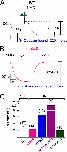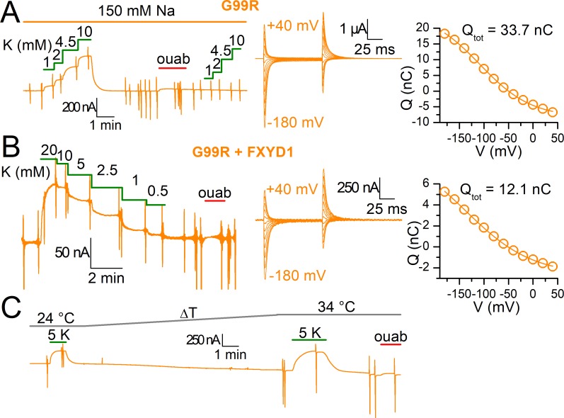 Figure 9. Function of G99R in 150 mM Na+o, with FXYD1 and at 34°C. (A) Continuous recording at −50 mV from an oocyte injected with G99R in which increasing K+o concentrations are applied in the presence of 150 mM Na+o (K0.5-V plotted in Fig. 8). The ouabain-sensitive currents in Na+o elicited by voltage pulses from −180 to 40 mV, in 20-mV increments, are shown in high temporal resolution in the center. The Q-V curve from those transient currents are shown on the right and was fitted with a Boltzmann distribution (line plot) with parameters Qtot = 33.4 nC, V1/2 = −108 mV, and k = 53 mV. All eight oocytes gave comparable results with inward currents absent from recordings. (B) Current at −50 mV from an oocyte injected with α1-G99Rβ1FXYD1 to which increasing K+o concentrations were applied in the 125 mM Na+o. The transient currents elicited are shown in the center and the Q-V curve from those transient currents are on the right. The Boltzmann distribution (fitted line plot) had parameters Qtot = 12.1 nC, V1/2= −136 mV, and k= 77 mV. Note that despite robust expression demonstrated by a large Qtot, the total pump current is largely reduced compared with G99R without FXYD1, even at 20 mM K+o. Three oocytes gave similar results with lower pump currents than non-FXYD1 coinjected oocytes. (C) Recording at −50 mV from an oocyte injected with G99R in which application of 5 mM K+o in 125 mM Na+o was performed at 24°C and then at 34°C. Note absence of significant inward current upon application of ouabain, despite deterioration of the oocyte. Three oocytes gave nearly identical results.