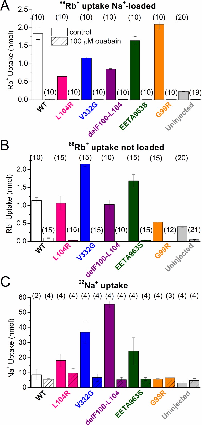 Figure 11. Radioactive 86Rb+ and 22Na+ uptake in oocytes expressing human Na/K pumps. (A) Mean 86Rb+ uptake in Na+-loaded oocytes, 4 d after injection, during 5-min incubation in 125 mM Na+o with 4.5 mM Rb+o, either in the absence (open bars) or presence (striped bars) of 100 µM ouabain. (B) Mean 86Rb+ uptake in oocytes, 4 d after injection, which were not Na+ loaded, during 15-min incubations in the same ionic conditions as in A. In both A and B, 86Rb+ uptake was also measured in uninjected oocytes from the same batches. (C) Mean 22Na+ uptake during a 2-h incubation in 125 mM Na+o by oocytes expressing wild-type or mutant pumps, 4–5 d after injection in the absence (open bars) or presence (striped bars) of 100 µM ouabain. The number of oocytes is indicated in parentheses above each column. Error bars represent SEM.
