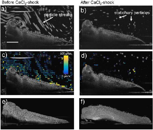 Figure 3. Imaging of ciliated frog embryo skin before (a,c,e,g) and after CaCl2-shock (b,d,f,h). (a,b) Maximum intensity projection of a 100-frame video allows the visualization of flowing tracer particles as particle streaks. After application of CaCl2 flow is disrupted along the whole embryo surface and tracer particles appear stationary. (c,d) Vector flow field of cilia-driven flow. The vector field is non-existent after application of CaCl2 (panel d). (e,f) 3D rendered speckle variance imaging. After CaCl2-induced loss of cilia, the surface appears smooth with uniform grey intensity (panel f). The scale bar in panel a measures 0.5 mm.