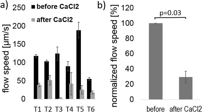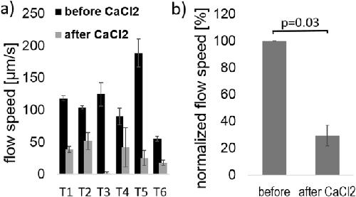Figure 4. (a) PTV-OCT results before and after application of CaCl2 to 6 Xenopus embryos. T1-T6 describes each individual animal. (b) Percentage decrease in flow speed after CaCl2 application. Error bars depict standard error. Wilcoxon signed rank test shows a significant decrease in flow speed (p = 0.03).