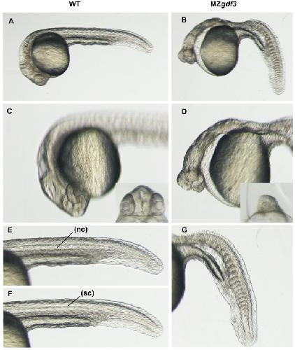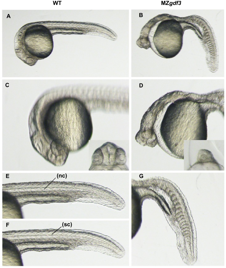 Figure 1—figure supplement 3. High magnification views of wild-type and MZgdf3 mutant embryos.Overview of WT (A) and MZgdf3 (B) embryos at 26 hpf. (C) A focal plane at the anterior neural tube of WT embryos shows well developed eyes and complex brain morphology including ventricles and a fold at the midbrain-hindbrain junction. The eyes (inset) are widely separated by the tissue of the forebrain. (D) In contrast to WT embryos MZgdf3 embryos have a narrow simple neural tube, and the eyes are cyclopic (inset). The large space between the anterior neural tube and yolk is created by the loss of pharyngeal endoderm and cranial mesoderm including the anterior lateral plate that gives rise to the heart. (E, F) The trunk and tail of a WT embryo shows a well-defined notochord (nc) in (E) and spinal cord (sc) in (F) and chevron-shaped somites. (G) The notochord and spinal cord are absent from the trunk and tail of MZgdf3 and the somites are U-shaped and malformed. |
