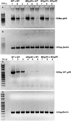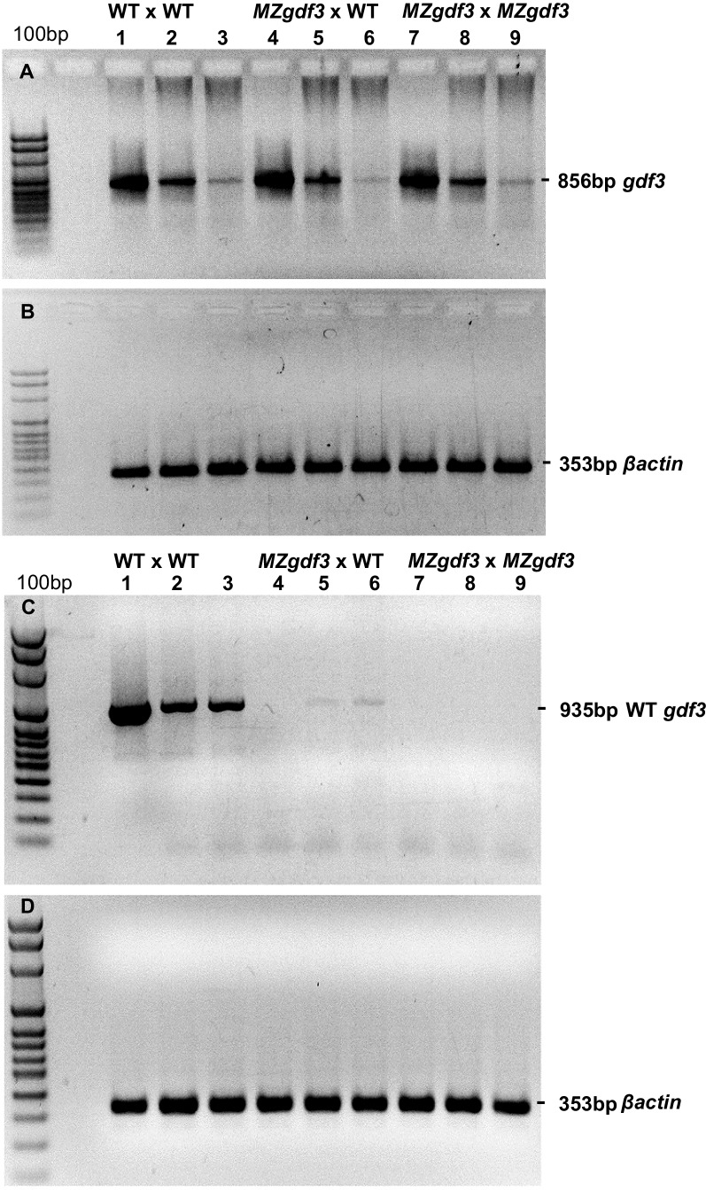 Figure 1—figure supplement 5. (A, B) RT-PCR analysis of cDNA prepared from 1000 cell-, 90% epiboly-, and 18 somite-stage embryo RNA, respectively, from: (Lanes 1–3) WT embryos, (Lanes 4–6) embryos derived from a female MZgdf3zy51 X WT male, and (Lanes 7–9) MZgdf3zy51 embryos.PCR primers: gdf3 cDNA fwd ACCCAAACCATCGCATCATG; gdf3 cDNA rev TTTGATGGGAACGCAACAGG. (B) Control RT-PCR of replicate samples of those in panel A using βactin (act2b) primers: βactin cDNA fwd CCCAAGGCCAACAGGGAAA; βactin cDNA rev GGTGCCCATCTCCTGCTCAA. (C, D) RT-PCR analysis of cDNA prepared from the same stages and genotypes as in panels A, B. PCR Primers: (C) WT-specific gdf3 fwd CCTCAGTCTCTGTTCTCCTGC; gdf3 cDNA rev TTTGATGGGAACGCAACAGG. (D) βactin cDNA fwd CCCAAGGCCAACAGGGAAA; βactin cDNA rev GGTGCCCATCTCCTGCTCAA. |