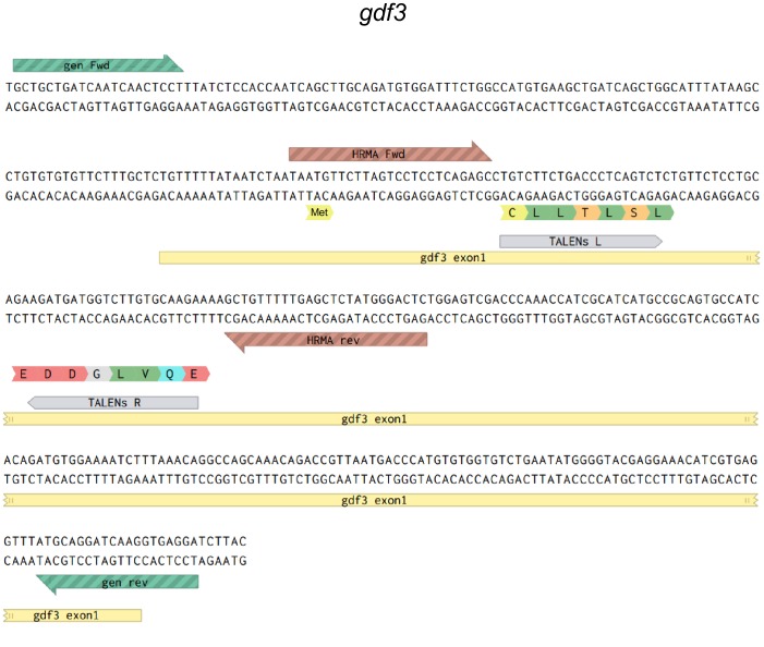 Figure 1—figure supplement 1. Map of the genomic sequences around the first coding exon of gdf3.Primers used to sequence genomic DNA flanking the TALEN target site are in green, HRMA primers are in brown and left (L) and right (R) TALENS are in grey. |
