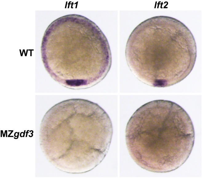 Figure 2—figure supplement 1. Nodal antagonists lft1 and lft2 are not expressed in MZgdf3.(A, B) Wild-type embryos at shield stage expressed lft1 (A) in dorsal mesoderm at the dorsal shield and in mesendoderm precursors at the margin while lft2 expression (B) was limited to the dorsal shield. Shield-stage embryos of MZgdf3 did not express either lft1 (C) or lft2 (B). |