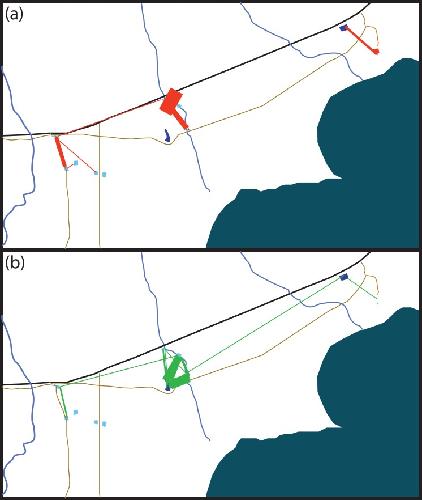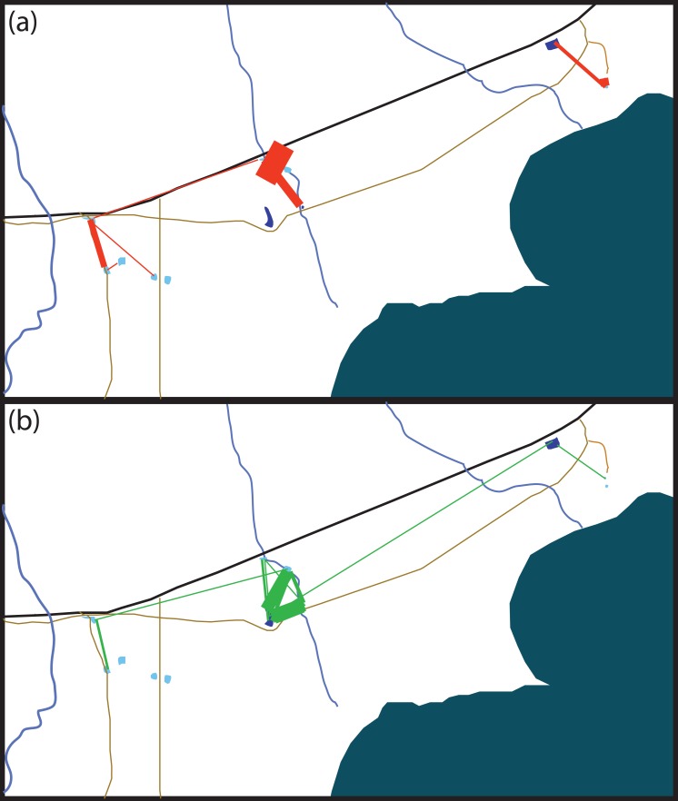 Figure 2. Schematic of movement by marked Xenopus laevis in (A) summer and (B) winter between water bodies.Thickness of red (A) and green (B) lines is proportionate to the amount of dispersal movements within that season. The site 5 km East of Kleinmond has natural temporary vleis (light blue) and anthropogenic impoundments (dark blue), and lies north of the brackish Botrivier Estuary. Paved (black line) and unpaved (brown lines) roads run through the area together with three temporary streams (blue lines).
