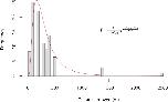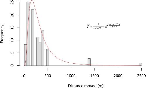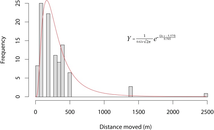 Figure 3. Dispersal kernel of Xenopus laevis at a site near Kleinmond, South Africa.Bars show the frequency of distances moved between water bodies by individuals during capture-mark-recapture based on 108 movements of 91 individuals over three years. The data is best described by a lognormal curve (red line), for which the probability density function is provided (Y is the expected frequency of moving frogs, and x is the distance moved).