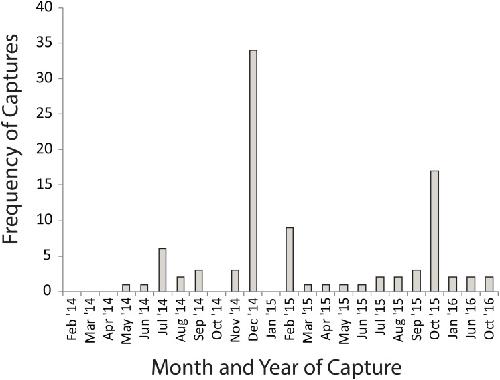 Figure 4. Numbers of Xenopus laevis caught per month in a pond other than the one in which they were marked.Spikes in December 2014 and October 2016 coincide with the drying of temporary waterbodies in those years.