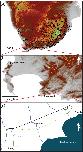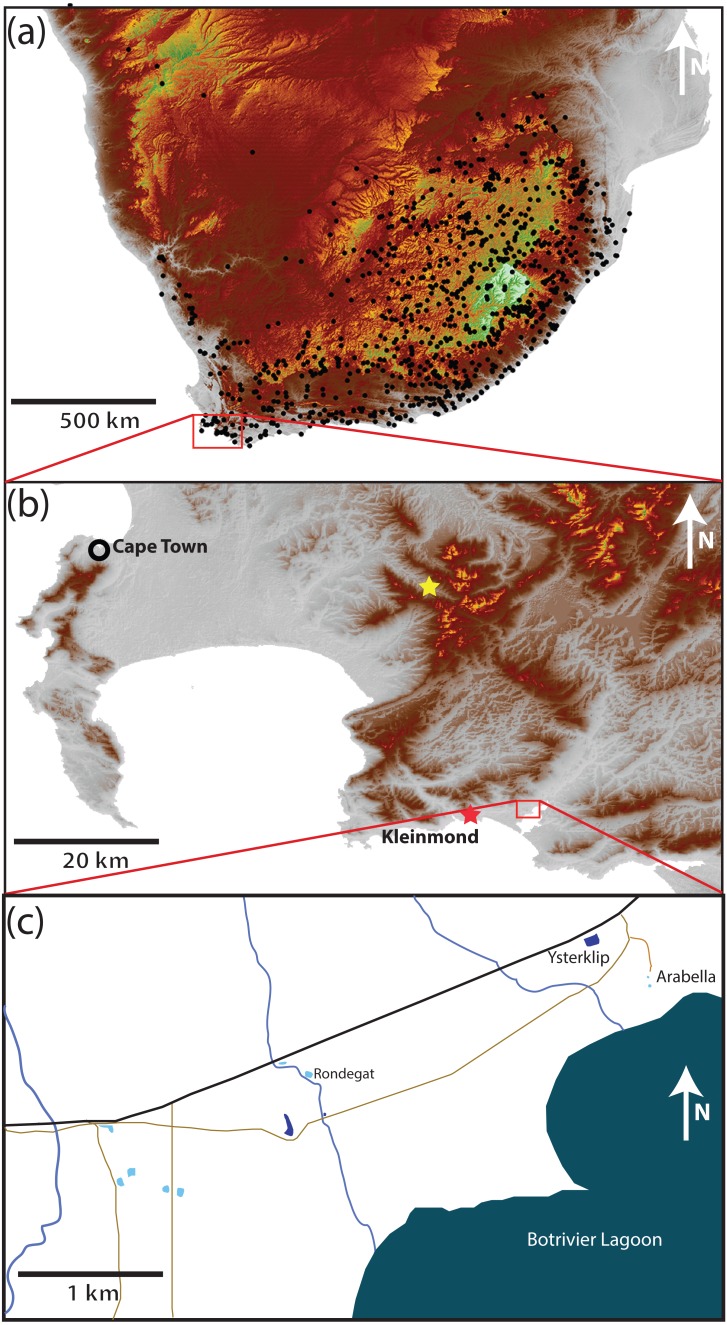 Figure 1. Position of the study site.(A) Southern Africa, with black dots showing known locations of Xenopus laevis. The data demonstrates the widespread distribution over the full altitudinal range of the region from the highlands of Lesotho (>3,000 m asl in white), through the Highveld of the escarpment (1,000 to 2,000 m asl in brown and yellow, respectively) to the lowland seaboard in grey (<500 m asl). (B) The site in the extreme southwest is 8 km East of Kleinmond (red star) borders the Botrivier Estuary to the South. The position of Jonkershoek (45 km north–west of the study site) is shown with a yellow star. The area is chosen to show the Cape Fold Mountains (brown to yellow) and extensive lowland (grey) areas.