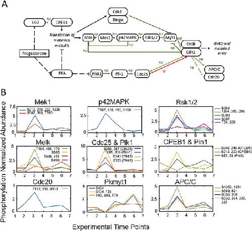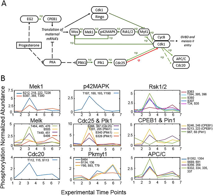 Figure 5. Phosphorylation events during progesterone-dependent oocyte maturation. (A) Outline of the major members of the signaling pathway for oocyte maturation initiated by progesterone adapted from87. Phosphorylation events are represented in green and dephosphorylation in red with arrows indicating activation and bars indicating repression. Pathways with intermediates not shown are indicated with a broken line. (B) The occupancy of individual phosphorylation sites in proteins within the pathway is presented relative to the seven experimental time points. Changes are normalized to the mean of the individual phosphopeptide. Inserts of each panel identify the detected sites of phosphorylation.
