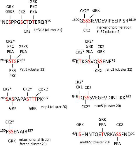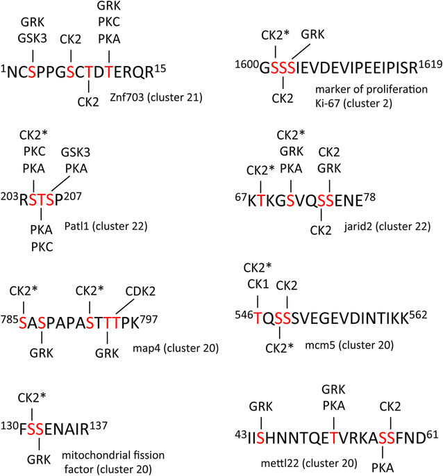 Figure 7. Clustered sites of phosphorylation. A selection of multiple-phosphorylated peptides is presented. Phosphorylation sites indicated in red had a minimum fractional occupancy of >0.1. Predicted kinase substrate sites were identified using PhosphoMotif Finder86. GRK (G protein-coupled receptor kinase), GSK3 (glycogen synthase kinase 3), CK2 (casein kinase 2), PKC (protein kinase C), PKA (protein kinase A), CDK2 (cyclin-dependent kinase 2), CK1 (casein kinase 1). CK2* indicates that phosphorylation at this site requires prior phosphorylation of a proximal priming site.
