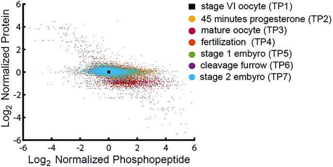 Figure 3. Galaxy plot correlating changes in protein levels with changes in phosphorylation. Individual protein abundances (plotted on the log2 axis) normalized to amount present in stage VI oocytes are plotted relative to phosphorylation site occupancy of that protein.