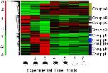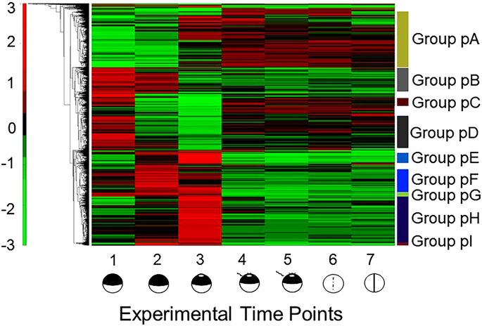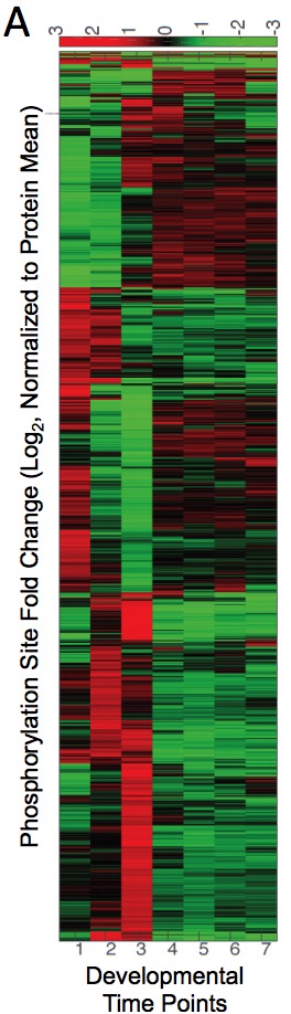 Figure 4. Heatmap displaying changes in absolute occupancy of individual phosphorylation sites. Nine groups were manually selected from the top 25% of sites having the greatest variation in phosphorylation across the seven experimental time points. The heatmap was generated using the MatLab Euclidian algorithm from the log2 normalized data. Individual cluster nodes were manually excised for further analysis. All values included are significant at a FDR of 0.15 using a Benjamini-Hochberg test.