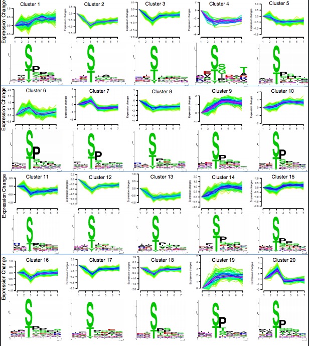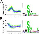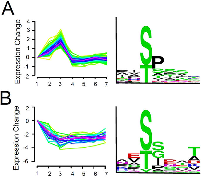 Figure 6. Consensus phosphorylation sites. GproX was used for unsupervised and unstandardized clustering of all identified phosphopeptide sequences. Upper and lower threshold log2 values of 0.26 and −0.32 were used, corresponding to ratios of 1.2 and 0.8, respectively. This generated 22 unique clusters according to changes in phosphorylation as a function of developmental time. Expression profile and corresponding consensus sequences generated using WebLogo for (A) cluster 20 and (B) cluster 21.