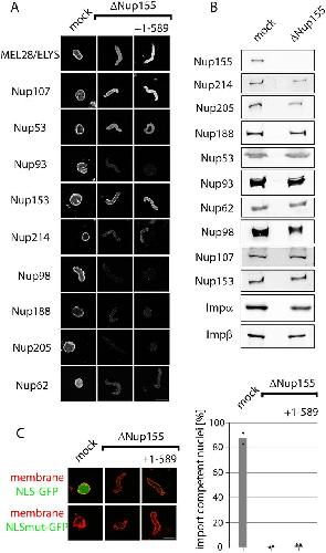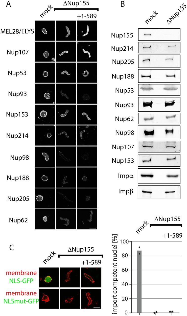 Fig.3. Nup155 supports assembly of the NPC structural backbone. (A) Nuclei assembled in mock, Nup155-depleted extracts (δNup155) or Nup155-depleted extracts supplemented with Nup155 1â589 for 120â min, fixed and stained with the respective antibodies. Scale bar: 10â μm. (B) Western blot analysis of mock and Nup155-depleted Xenopus egg extracts from the experiment in A. (C) Nuclei were assembled as in A. After 60â min an EGFP-tagged importin-α/β-dependent nuclear import substrate was added in a final concentration of 300â nM. Nuclei were fixed after a further 70â min and analyzed by confocal microcopy. Quantification shows the average of two independent experiments with 100 chromatin substrates analyzed per condition. Data points from the two individual experiments are indicated.