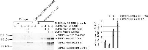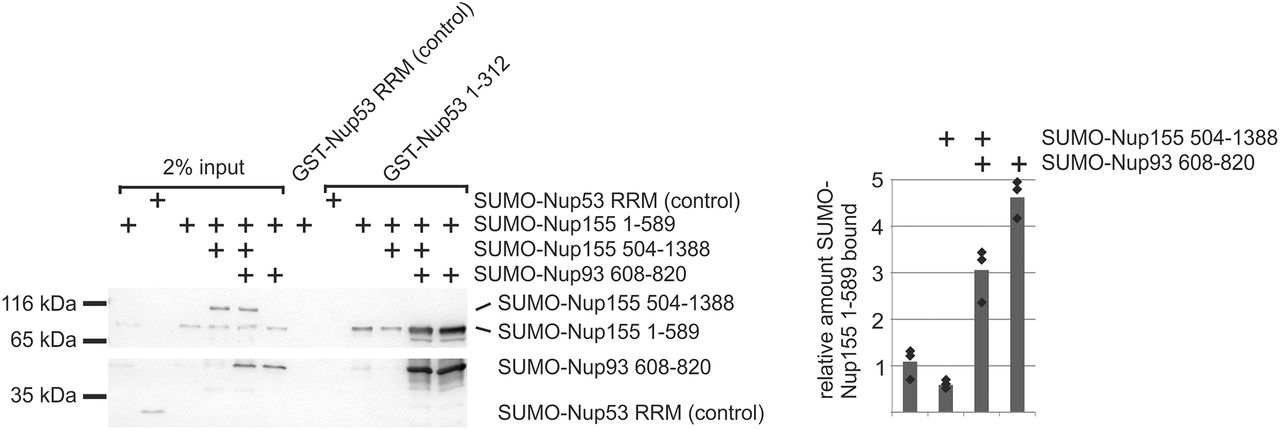 Fig.5. Nup93 can override the inhibitory effect of the Nup155 C-terminus. Western blot analysis of 0.5â µM GST fusion constructs of the Xenopus Nup53 RRM domain (aa 162â267, control) or an Nup53 fragment including the Nup93 and Nup155 binding regions (aa 1â312) incubated with 0.5â µM SUMOâNup53(RRM) (control) or SUMOâNup155(1â589). Where indicated, SUMO-tagged C-terminal fragments of either Nup155(504â1388) or Nup93(608â820) were added in sixfold excess (3â µM) over SUMOâNup155(1â589). The right panel shows the average of the SUMOâNup155(1â589) prey bound to GSTâNup53(1â312) bait in the absence or presence of SUMOâNup155(504â1388) and SUMOâNup93(608â820) from three independent experiments. Data points from individual experiments are indicated. Eluates and 2% of the input were analyzed by western blotting using an antibody against the 6ÃHis tag.