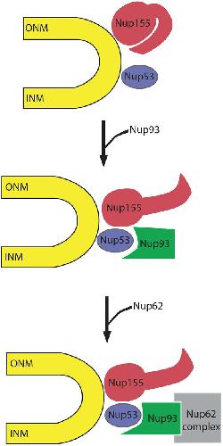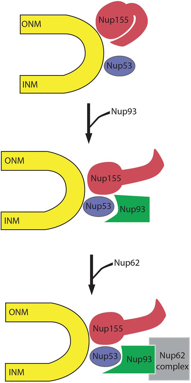 Fig.6. Nup155 is recruited to the pore via Nup53 and requires Nup93 to become competent for NPC assembly. Model for inner pore ring assembly. Nup53 binds to the nascent pore via its pore membrane interaction and contributes to curvature stabilization. Nup155 is recruited in loco via its N-terminal domain. At this step, Nup155 is found in a self-inhibitory conformation, because of the interaction of its N- and C-terminal moieties. Binding of Nup93 to Nup53 stabilizes the Nup155–Nup53 interaction by overcoming the auto-inhibitory effect of the C-terminal of Nup155 on the complex. Nup93 then recruits the Nup62 complex, leading to assembly of transport-competent NPCs. The direct and mutually exclusive Nup93 interaction partners Nup188 and Nup205 are not shown.