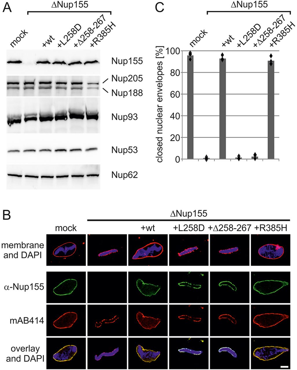 Fig.1. Direct membrane binding of Nup155 is crucial for NPC assembly. (A) Western blot analysis of mock-treated and Nup155-depleted Xenopus egg extracts, with or without addition of Nup155 addback and mutants. (B) Confocal microscopy images of fixed nuclei assembled for 120â min in mock-depleted (mock) and Nup155-depleted (δNup155) Xenopus egg extracts supplemented with either buffer, wild-type Nup155 mRNA, or mRNA encoding the membrane binding mutants L258D and δ258â267, as well as the mutant Nup155(R385H), which causes cardiac disease. Membranes were pre-labelled with DiIC18 (1,1â²-dioctadecyl-3,3,3â²,3â²-tetramethylindocarbocyanine perchlorate, red in overlay) and chromatin was stained with DAPI (4â²,6-diamidino-2-phenylindol, blue in overlay). The bottom panels show immunofluorescence staining for Nup155 (green) and NPCs (mAB414, red) on the chromatin (DAPI, blue in overlay). Scale bars: 5â µm. (C) The average percentage of closed nuclear envelopes for 100 randomly chosen chromatin substrates in each of three independent experiments. Data points from individual experiments are indicated.